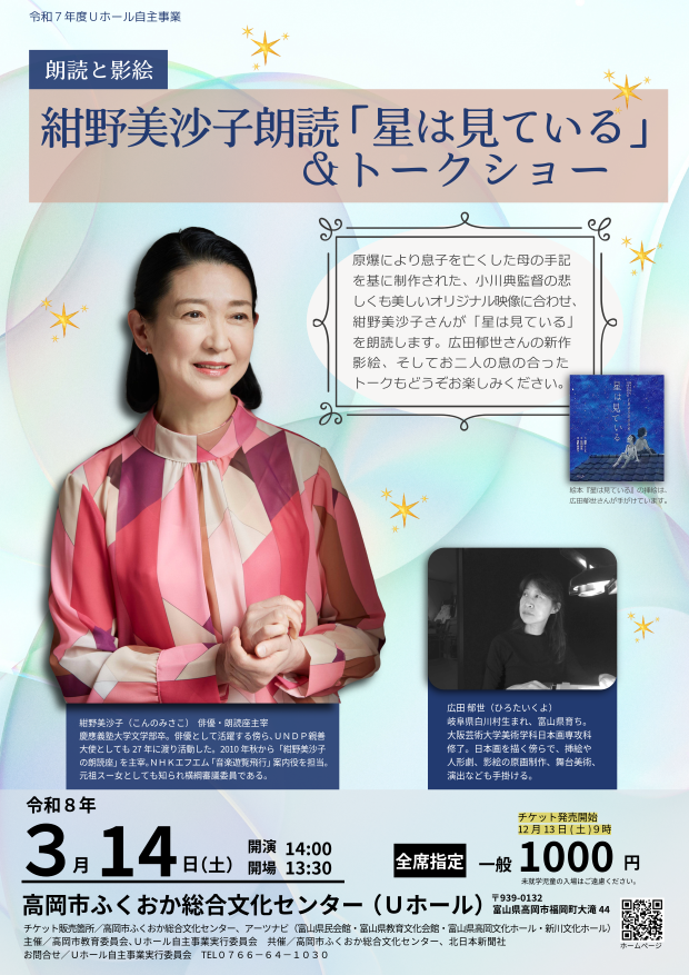 原爆により息子を亡くした母の手記を基に制作された小川典監督の悲しくも美しいオリジナル映像に合わせ、紺野美沙子さんが『星を見ている』を朗読します。広田郁世さんの新作影絵、そしてお二人の息の合ったトークもどうぞお楽しみください。